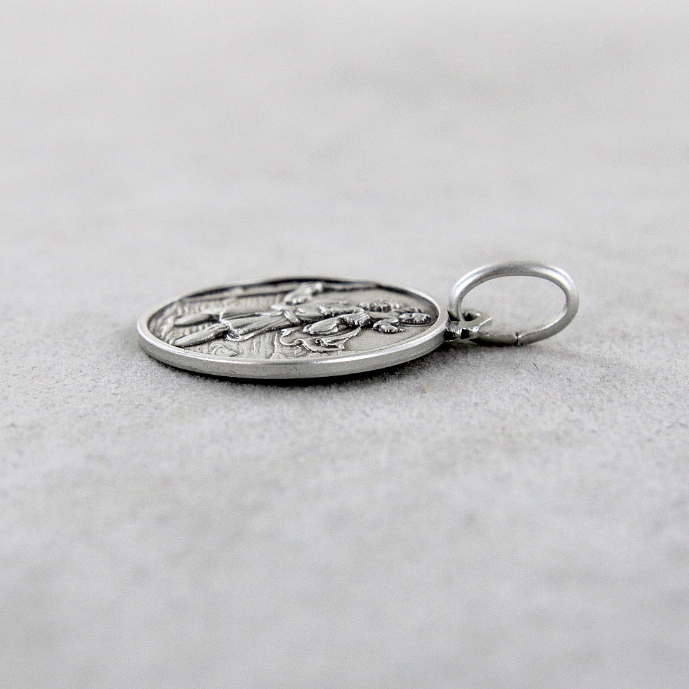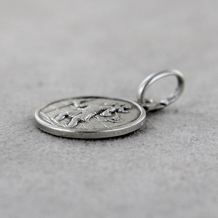 Il retro della medaglia in argento di San Cristoforo è a finitura liscia e permette un’incisione come personalizzazione della medaglia, è infatti possibile incidere un nome, una data oppure una breve dedica, compatibilmente con lo spazio a disposizione.