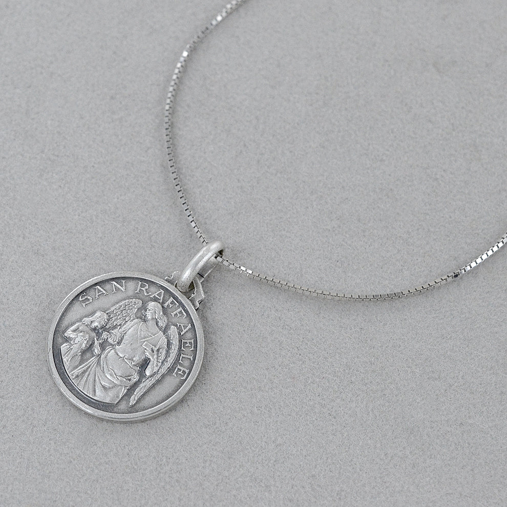 La medaglia di San Raffaele è in argento 925/000 prodotta a conio mediante un processo artigianale altamente esclusivo che rende questa medaglia religiosa un vero e proprio gioiello religioso da indossare. La medaglia di San Raffaele è disponibile in quattro differenti misure, definite come S, M, L e XL.