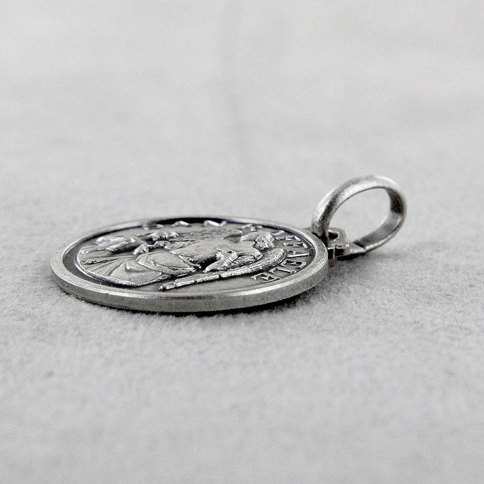 Il retro della medaglia in argento di San Raffaele è a finitura liscia e permette un’incisione come personalizzazione della medaglia, è infatti possibile incidere un nome, una data oppure una breve dedica, compatibilmente con lo spazio a disposizione.