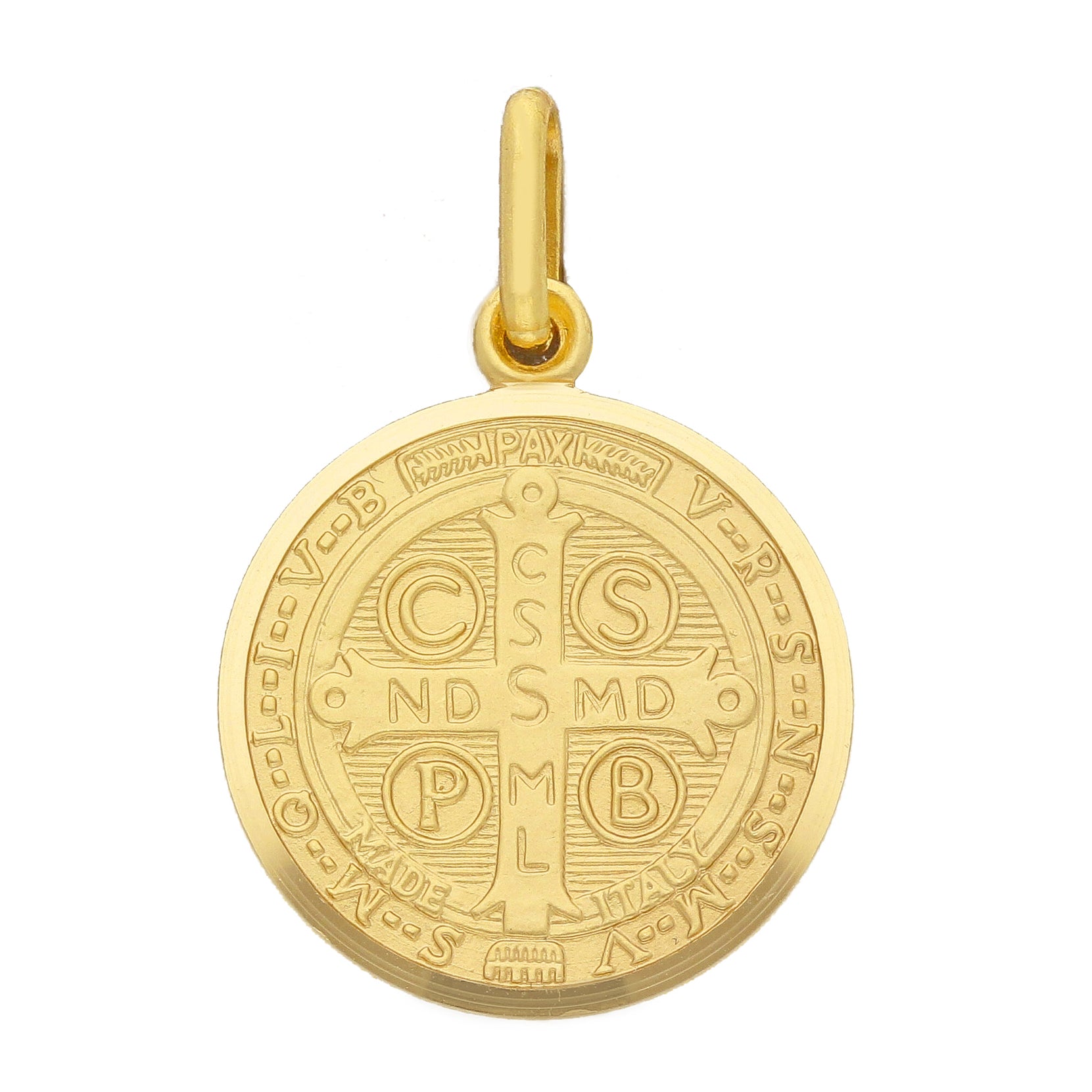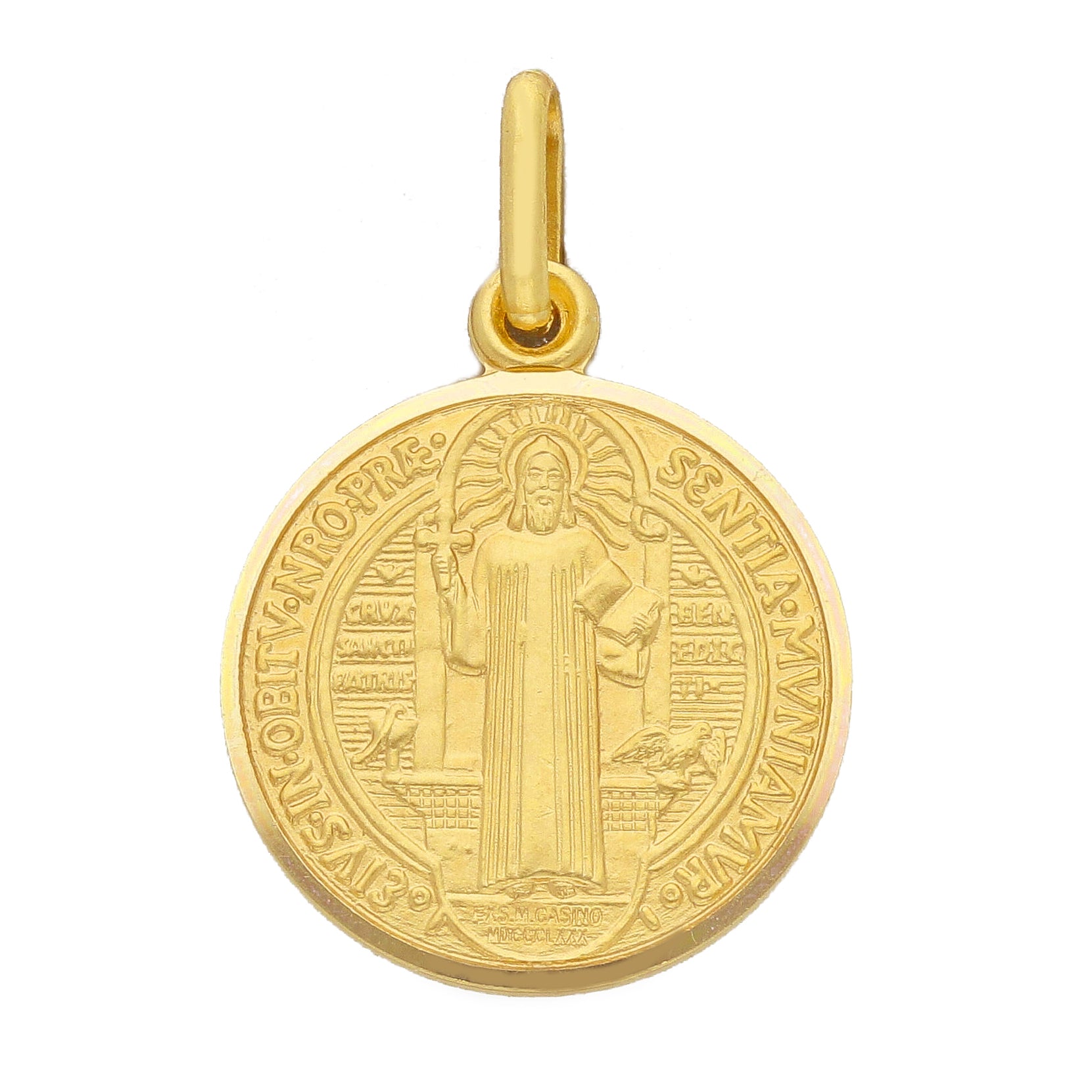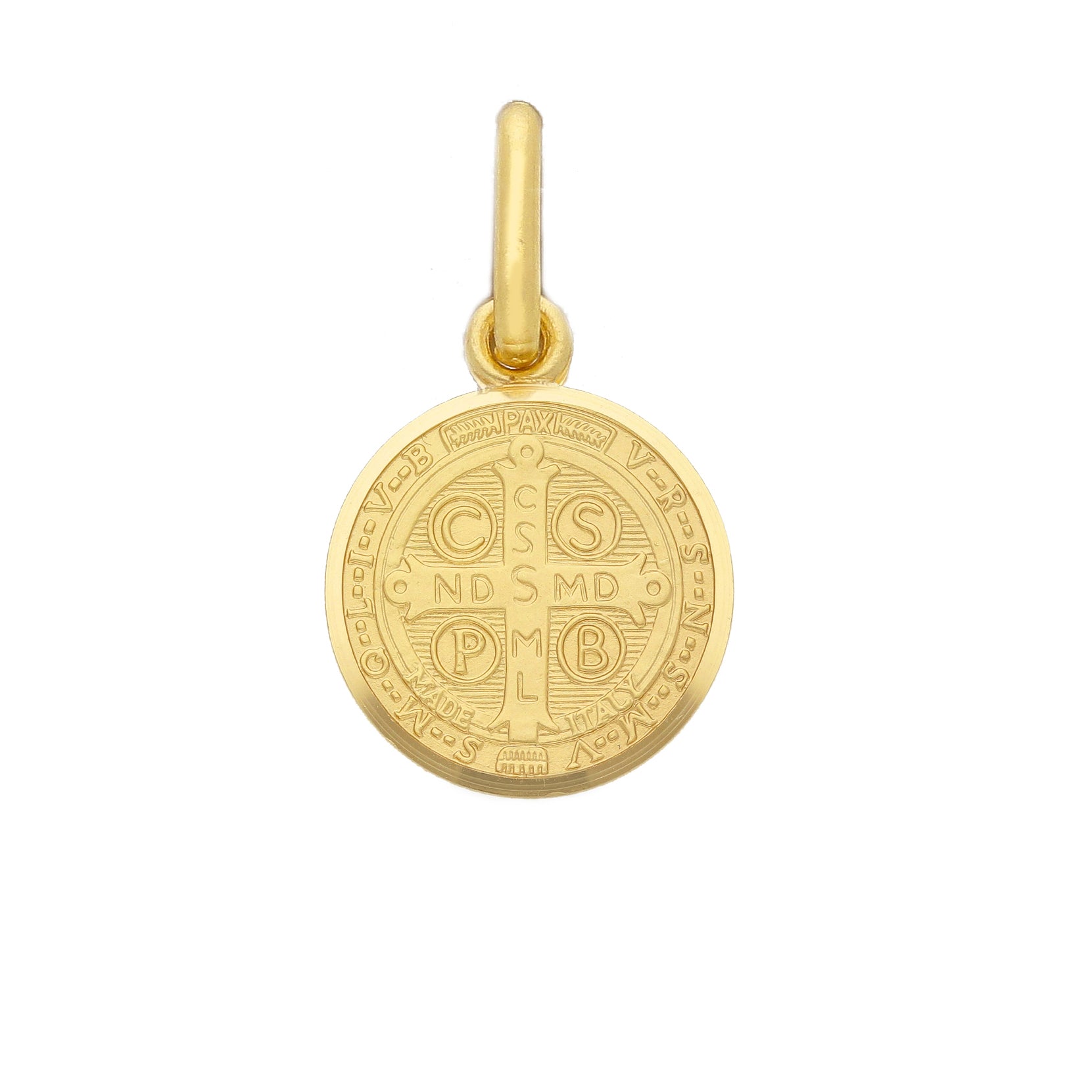 La medaglia di San Benedetto in oro giallo è realizzata a conio sul fronte e riporta minuziosamente i dettagli della sua iconografia, meticolosamente realizzata a conio in tutte le sue caratteristiche.